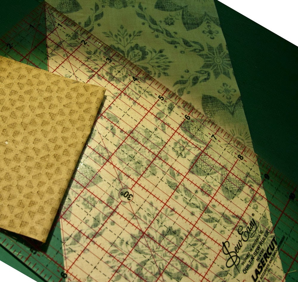 I don't understand the markings on this one, and rather than work it out, I'll just use it the way I want to. I know my piece is coming from a 4.5" square, so I just line up the top and make sure the ruler is centred and away I go. I cut all the lozenges for my
